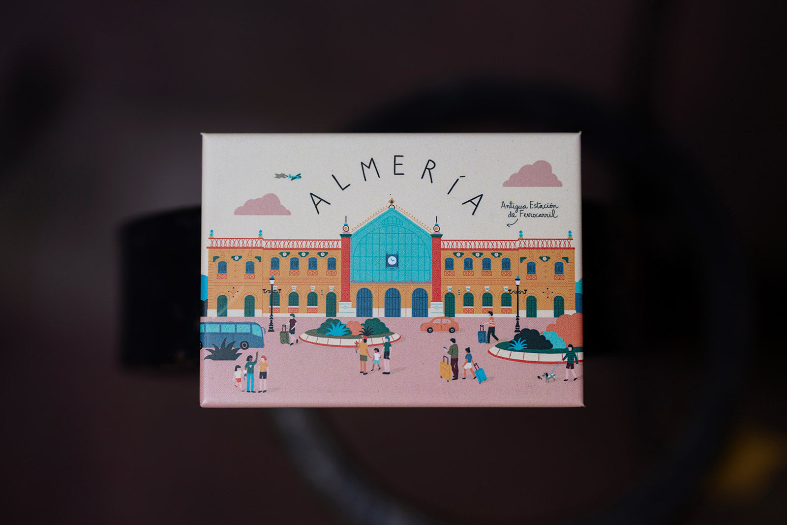 Imán rectangular con ilustración de la Antigua Estación de Almería. Acabado mate